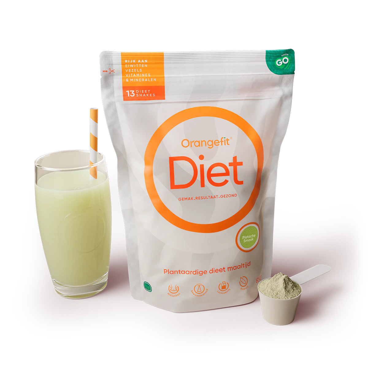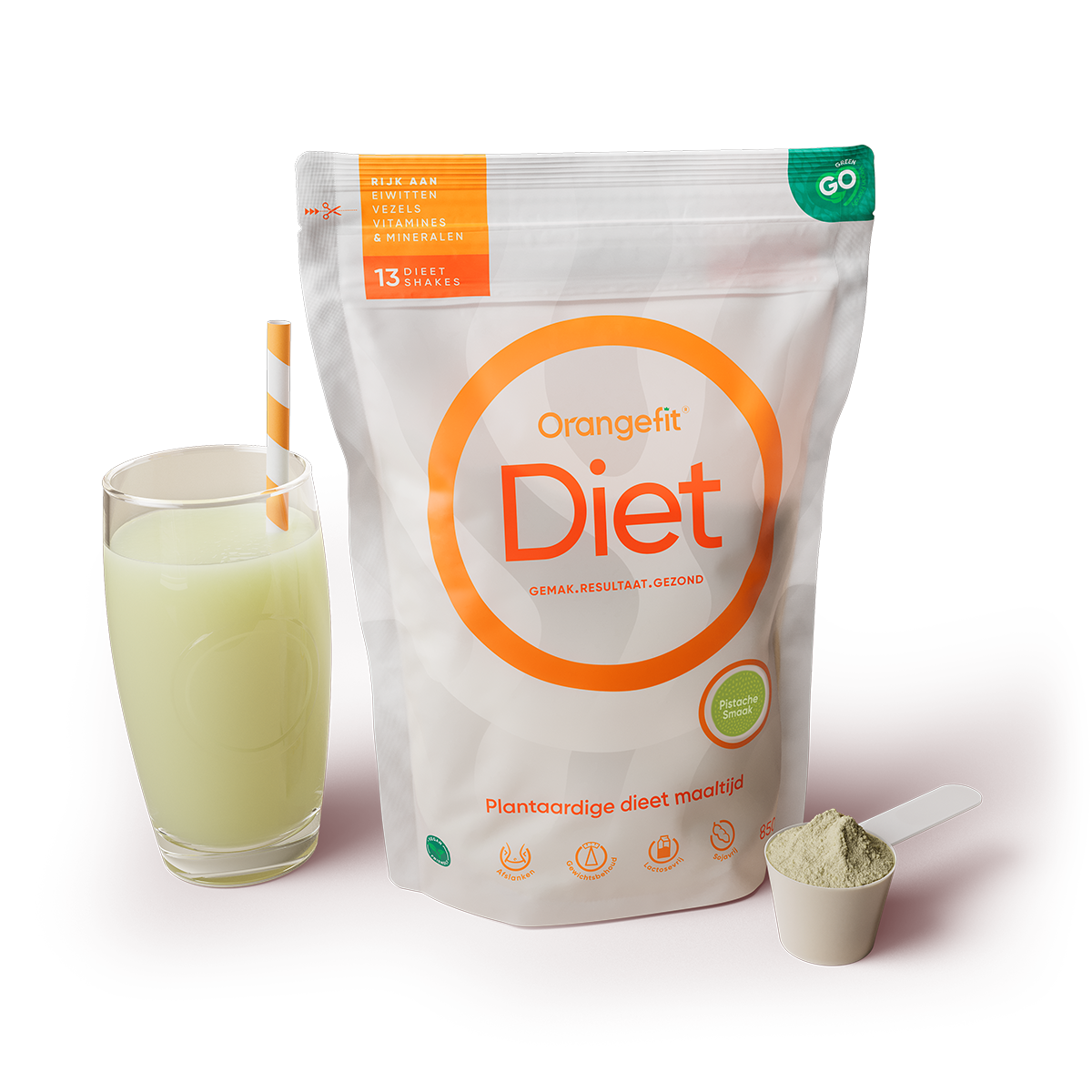 Orangefit® Diet besteht aus Erbsenprotein (eine vollständige Eiweißquelle), Hafermehl, Leinsamen und grünem Tee. Jede Mahlzeit liefert dir 30 % deines täglichen Bedarfs an Vitaminen und Mineralstoffen.