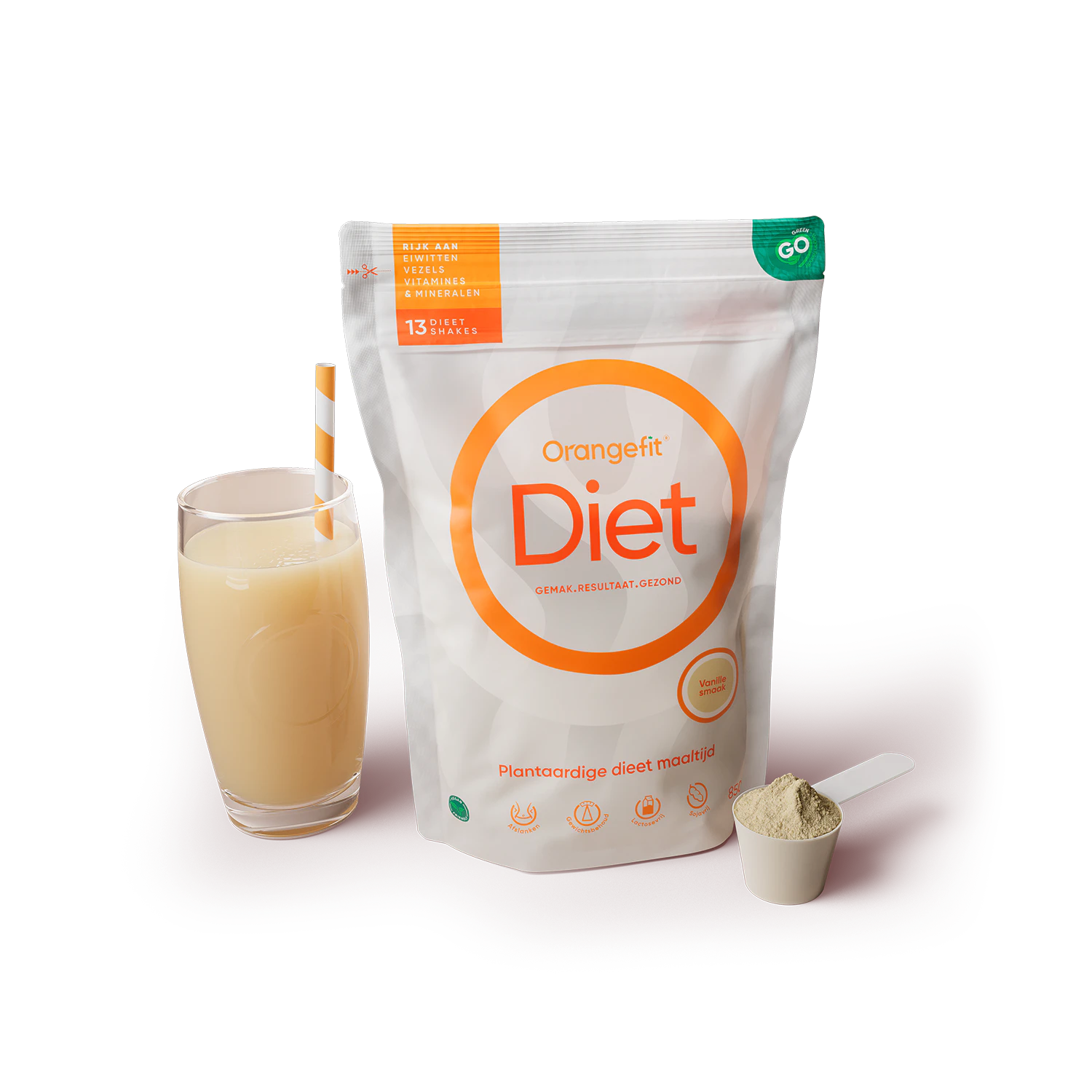 Orangefit® Diet besteht aus Erbsenprotein (eine vollständige Eiweißquelle), Hafermehl, Leinsamen und grünem Tee. Jede Mahlzeit liefert dir 30 % deines täglichen Bedarfs an Vitaminen und Mineralstoffen.